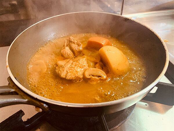 原材料名:鶏肉・じゃがいも・たまねぎ・にんじん・マッシュルーム・ソース・カレーペースト・生クリーム(乳を含む)・ターメリック・コリアンダー・クミン・フェネグリーク・コショウ・オレガノ・ガーリック・赤唐辛子・ちんぴ・コーンパウダー・その他香辛料・塩・大豆油・白ごま/調味料(アミノ酸等)