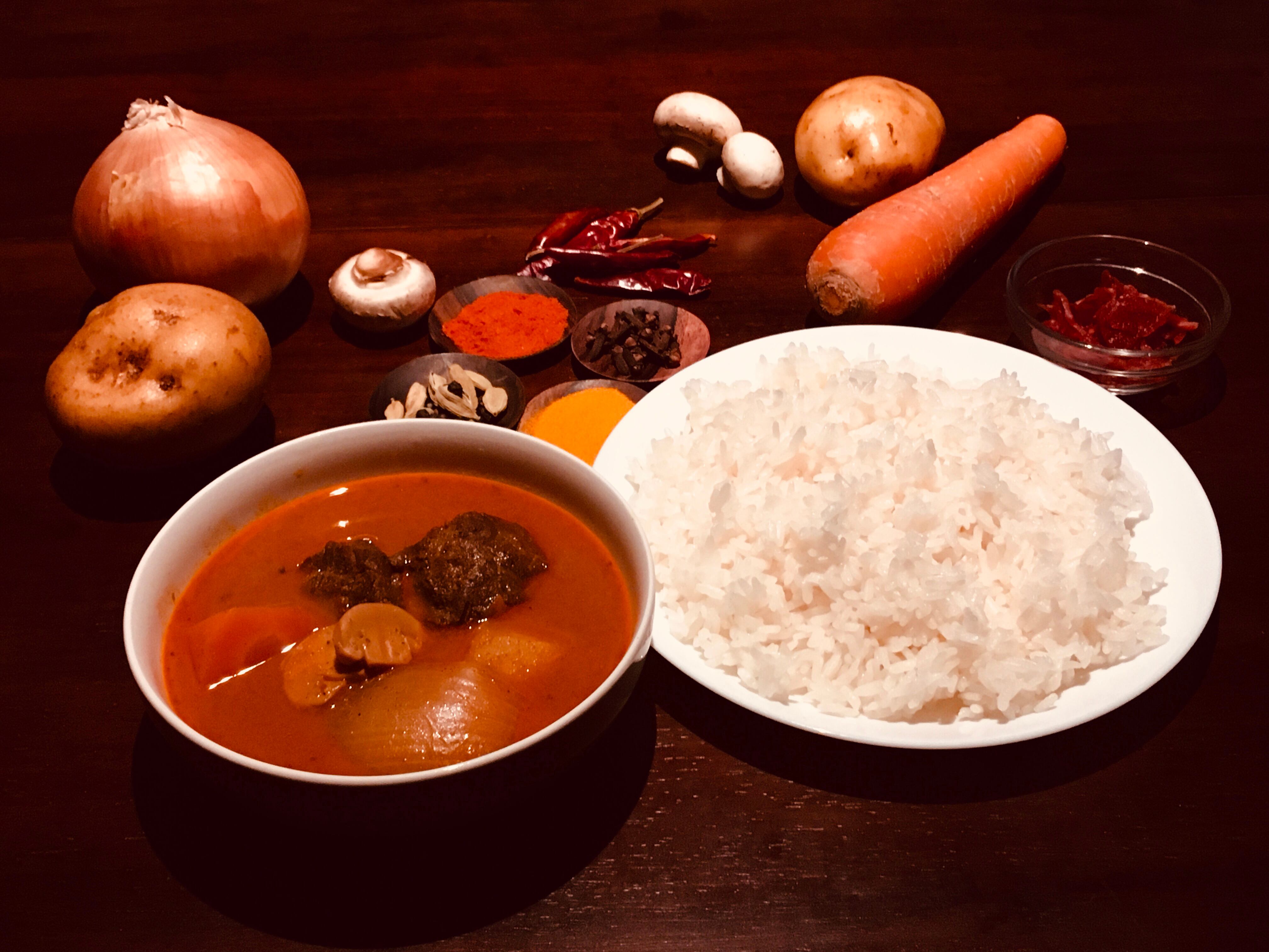 独自の調理法でカレーに入っている具材の一つ一つの味がしっかりと愉しめるように仕上げました。具材のチキンの歯ごたえはしっかりしていて、肉の下ごしらえに漬け込んだスパイスとチキンの味と香りのバランスを考えました。じゃがいも・たまねぎ・にんじん・マッシュルームには、それぞれふっくらな食感と素材の味をしっかりと残しつつ、じっくりとスープの味を染み込ませています。