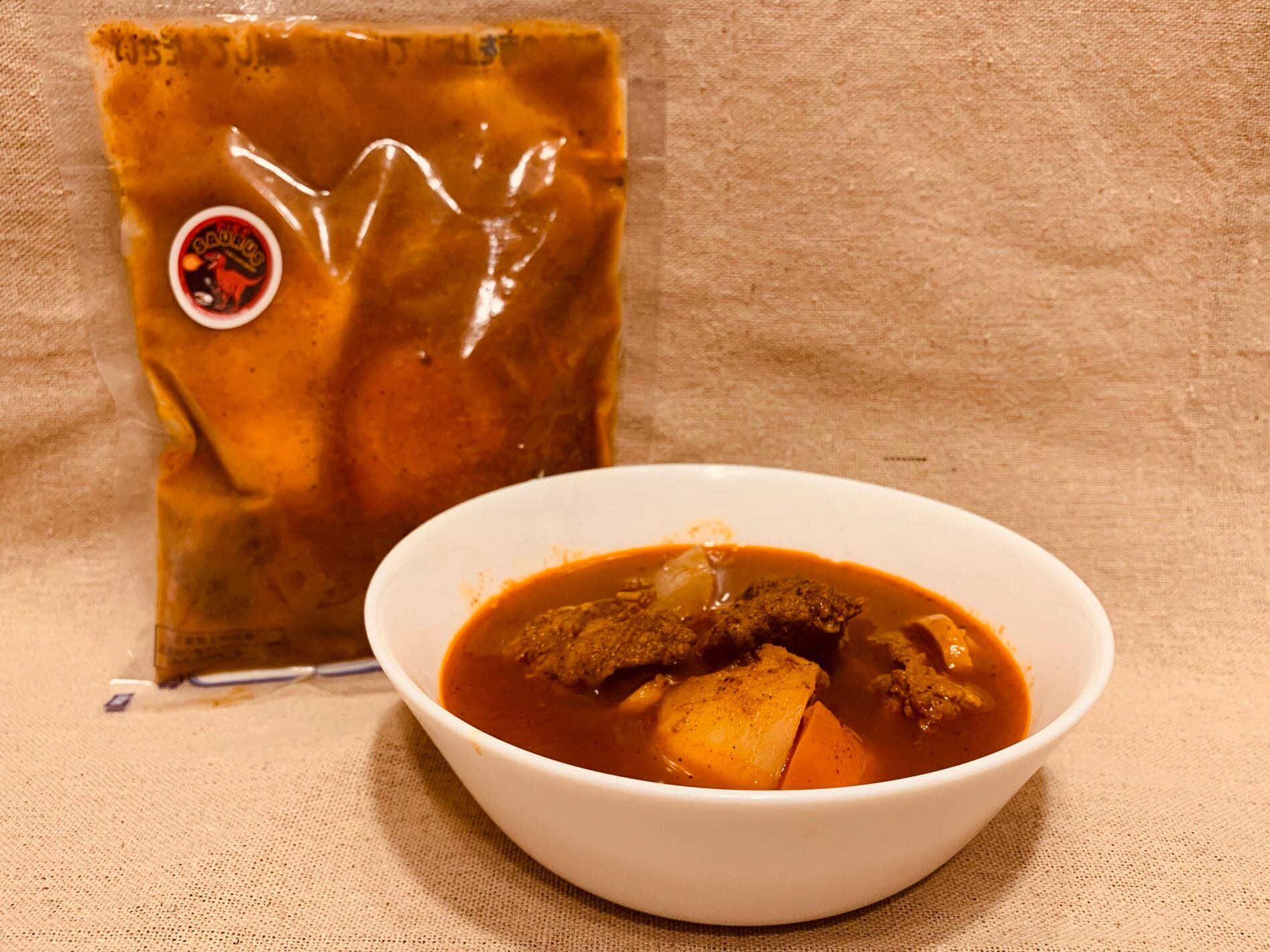 原材料名:牛肉・じゃがいも・たまねぎ・にんじん・マッシュルーム・ソース・カレーペースト・ワイン・牛乳・生クリーム・ターメリック・コリアンダー・クミン・フェネグリーク・コショウ・オレガノ・ガーリック・赤唐辛子・ちんぴ・コーンパウダー・その他香辛料・塩・大豆油・白ごま/調味料(アミノ酸等)